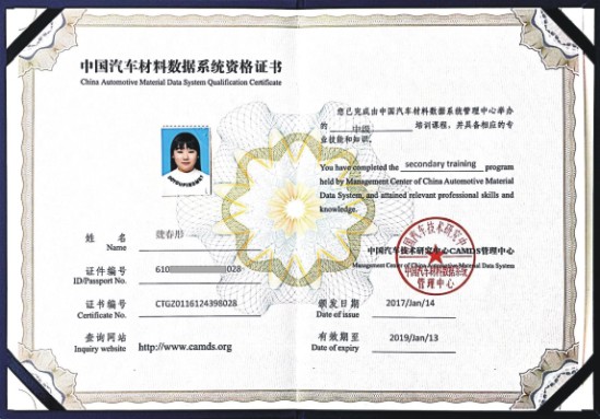 中國(guó)汽車材料數(shù)據(jù)系統(tǒng)中級(jí)資格證書
